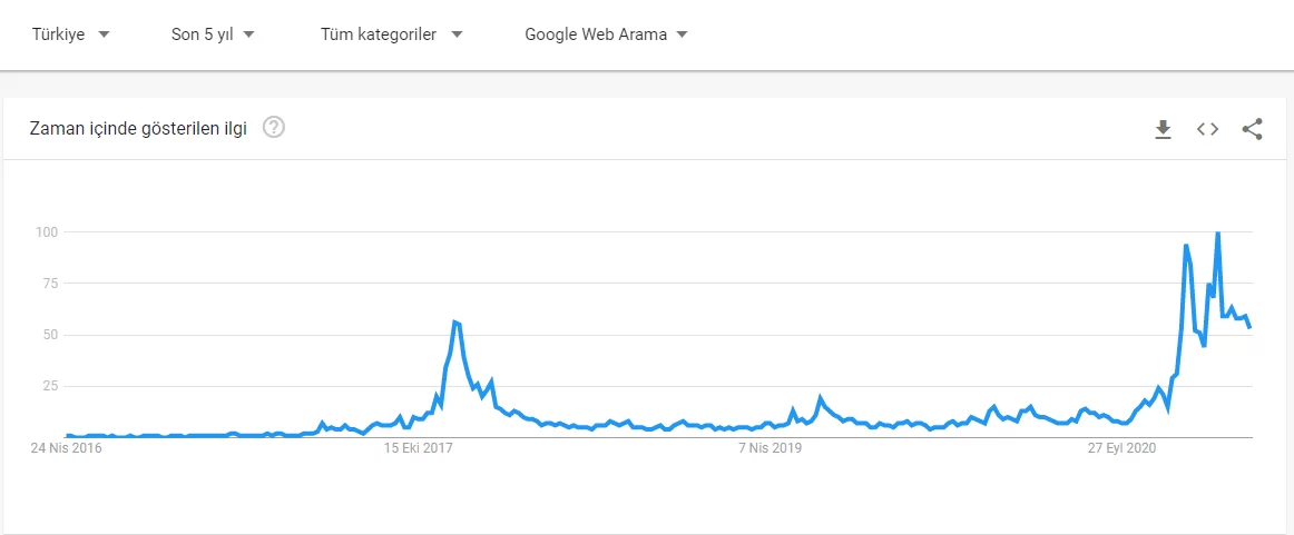 Türkiye’deki Bitcoin aramalarına ilişkin grafik, yatırımcı ilgisinin 2017 yılından çok daha yüksek seviyede olduğunu gösteriyor.