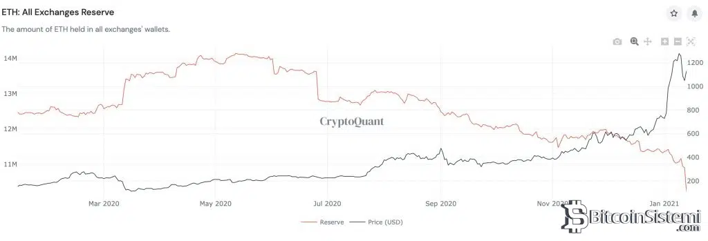 Ethereum’un borsalarındaki arzının azaldığını gösteren diğer bir grafikte CryptoQuant verilerine dayanıyor.