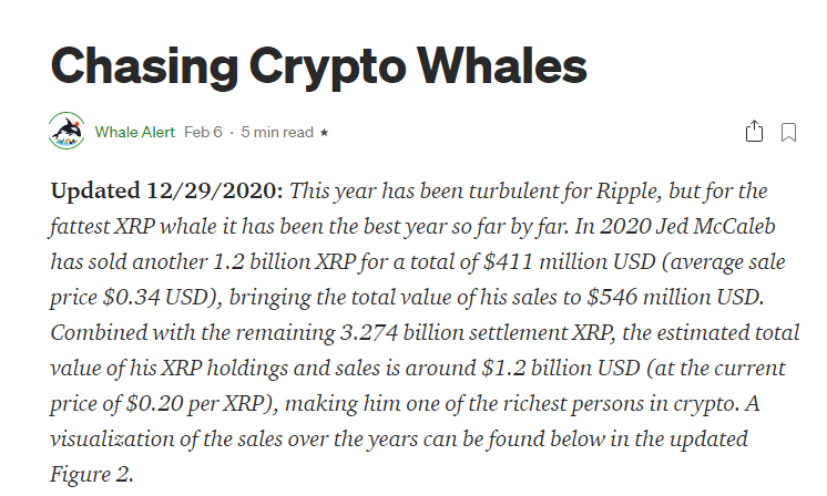 Whale Alert’e göre 2020 satışları ile beraber, McCaleb’in XRP’den bugüne kadar kazandığı para 546 milyon $’ı buldu. McCaleb’in elindeki 3.274 milyar XRP’yi, ortalama 0.20$’dan sattığı düşünüldüğünde net kazancı 1.2 milyar dolar olacak. Whale Alert bu satışların önümüzdeki 20 yıla yayılarak yapılacağını düşünüyor.