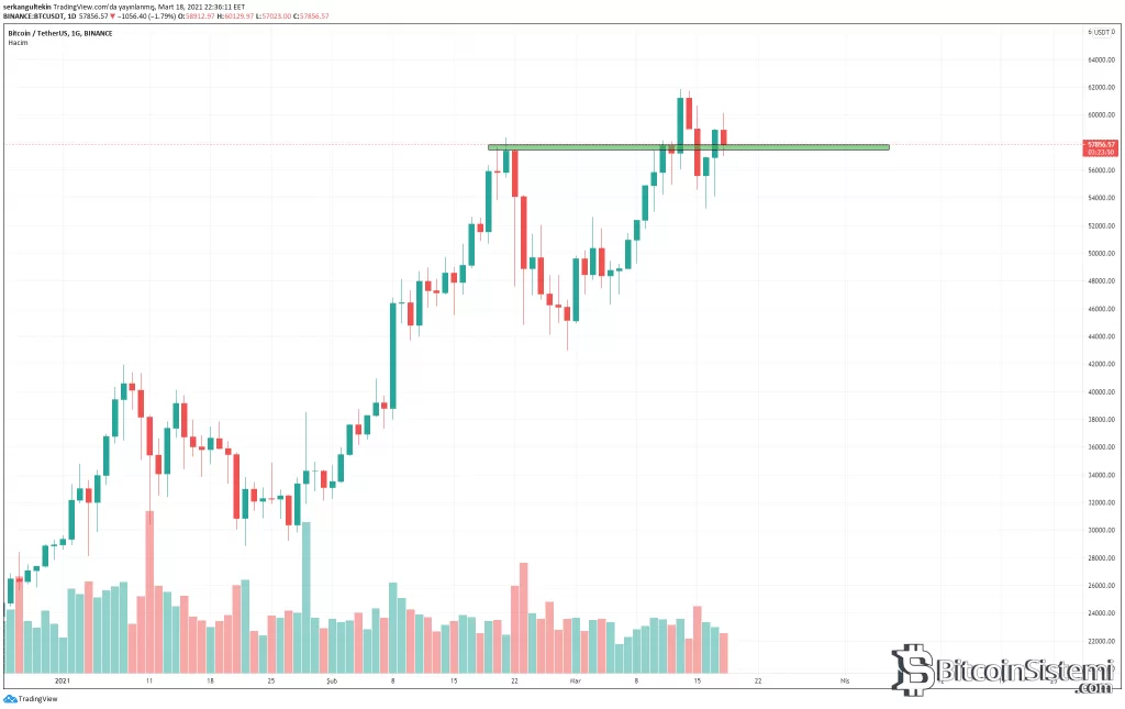 Bitcoin’de teknik olarak 57400$ ve 57820$ iki önemli seviye olarak göze çarpıyor. Bu seviyelerinden üzerinde yapılacak gün kapanışları yükselişin devamı için önem arz ediyor.