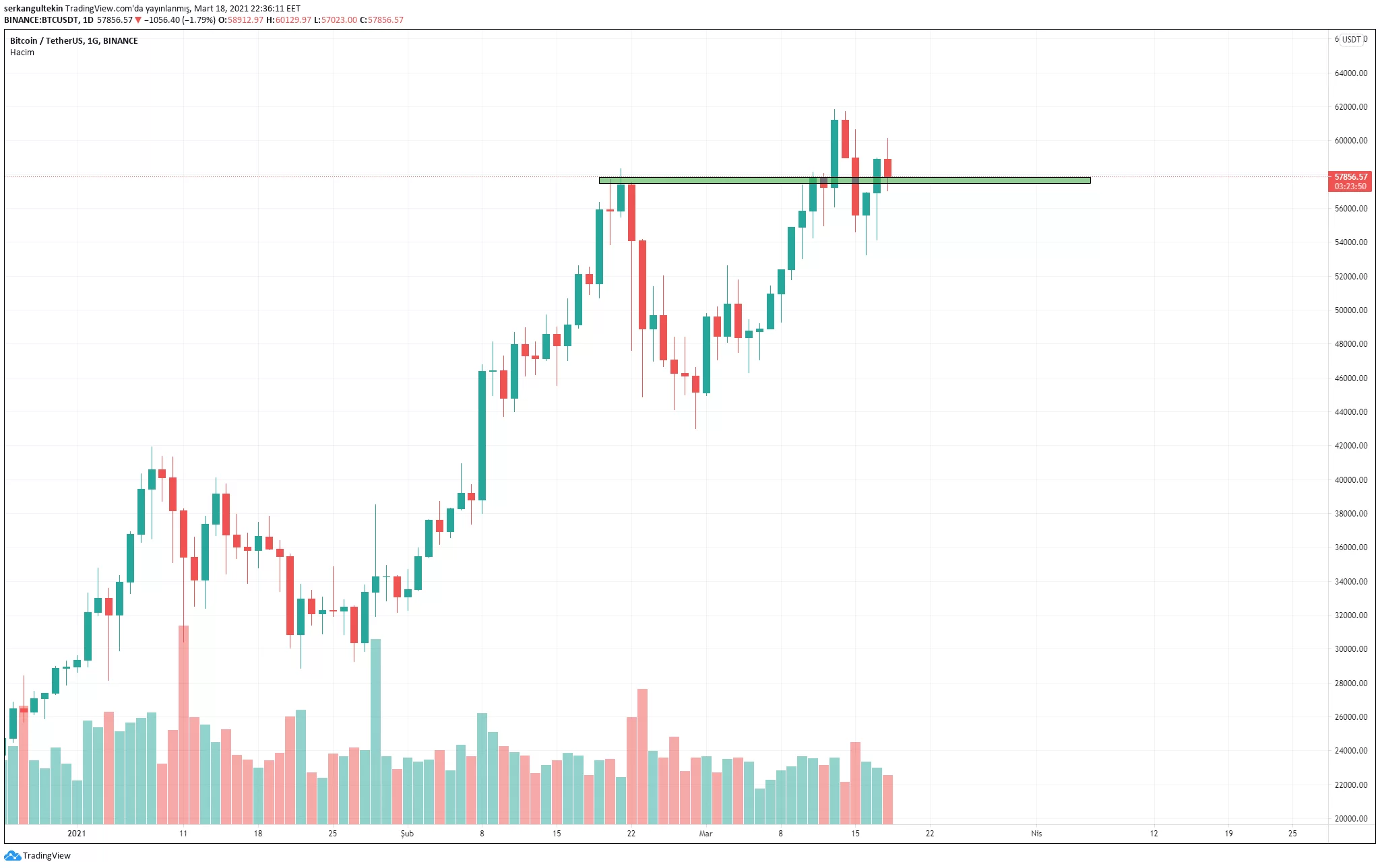 Bitcoin’de teknik olarak 57400$ ve 57820$ iki önemli seviye olarak göze çarpıyor. Bu seviyelerinden üzerinde yapılacak gün kapanışları yükselişin devamı için önem arz ediyor.