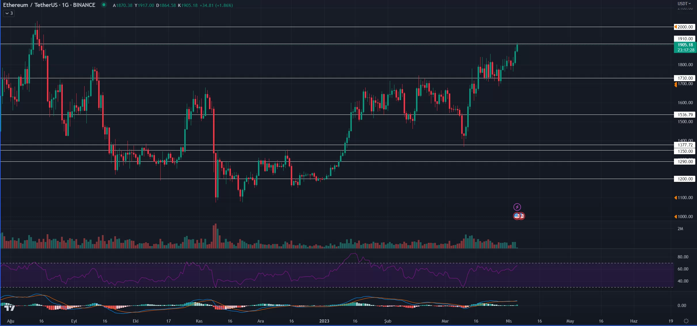 Ethereum için bir sonraki direnç noktası 1910 dolar olurken, bu seviyenin kırılması ile beraber en önemli seviye şüphesiz 2000 dolarlık psikolojik direnç seviyesi olacaktır.