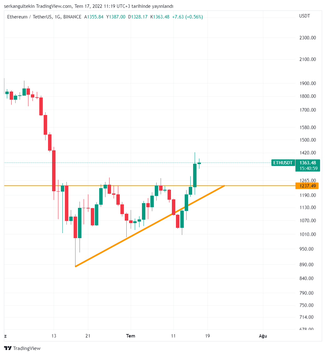 Teknik olarak baktığımızda Ethereum’da yukarı yönlü önemli bir kırılım geldiğini görüyoruz. Kırılımın fake-out olarak kalmaması için 1240$ seviyesi korunmalı.