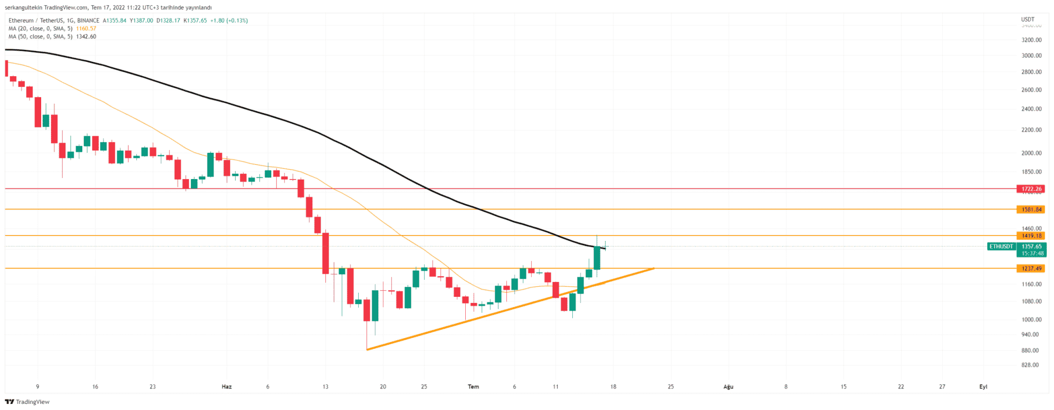 Buna göre 1342$ üstü kapanışlarda 1722$’a kadar gelebilecek yükselişler bizi şaşırtmayacaktır. 1722$ aynı zamanda yükselen üçgen hedefi olarak karışımıza çıkıyor.
