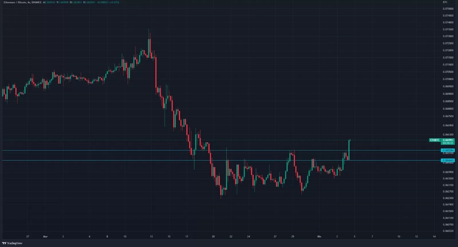 Kripto paraların tarihsel olarak genellikle yükseldiği Nisan ayında ETH’nin oyunun bir parçası olarak Bitcoin’e karşı değer kazanmaya çalıştığını görüyoruz.”