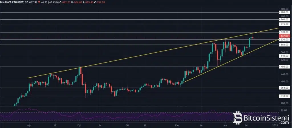Destek ve direnç noktalarına baktığımızda ise bu aşamada yükseliş trendini bozacak en önemli destek seviyesi 630 dolar olurken, önemli direnç seviyeleri ise 670, 715 ve 740 dolar olarak karşımıza çıkıyor.