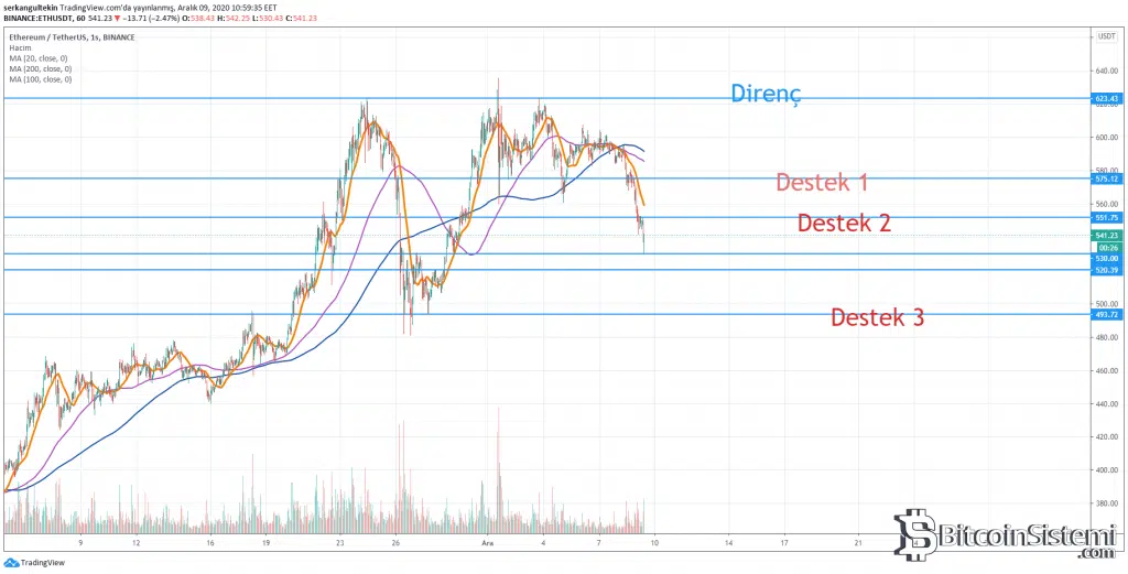 Grafikte görüleceği üzere 575$ seviyelerinde tutunmaya çalışan ETH, bu seviyenin kırılmasıyla hızla 550$ desteğine indi. Bunun da kırılmasıyla 530$ desteğine tutundu. 530$ ve 520$ seviyelerindeki desteklerin zayıf destekler olduğunu belirtmek isteriz.
