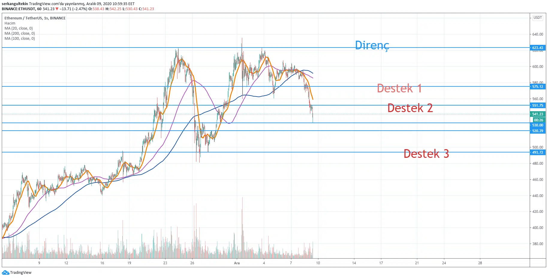 Grafikte görüleceği üzere 575$ seviyelerinde tutunmaya çalışan ETH, bu seviyenin kırılmasıyla hızla 550$ desteğine indi. Bunun da kırılmasıyla 530$ desteğine tutundu. 530$ ve 520$ seviyelerindeki desteklerin zayıf destekler olduğunu belirtmek isteriz.