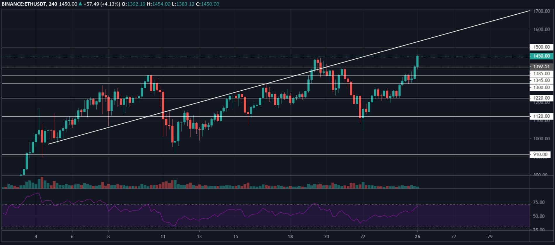 Bu seviyelerden sonra tekrar yükseliş ivmesi yakalayan ETH, yayın saatine göre 1450 dolar seviyelerini görerek yeni rekor seviyesine ulaşmış oldu. Son 24 saat içerisinde yatırımcısına yüzde 15 oranında kazanç sağlayan ETH yükselişlerine devam ettikçe altcoinlere akan para miktarı da artıyor.