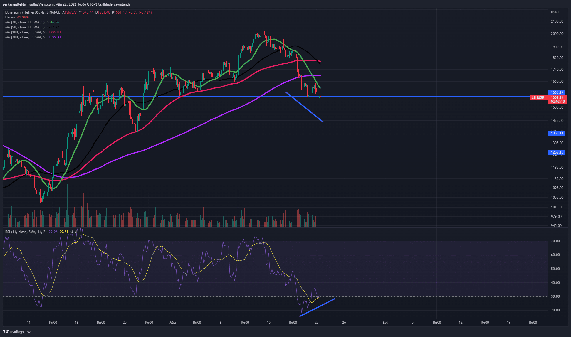 Ethereum 1900$’ı geçtiğinde hem ETH/USDT hem de ETH/BTC paritesindeki RSİ uyumsuzluğuna dikkat çekmiş ve şimdi Ethereum alınır mı? sorusunu sormuştuk.