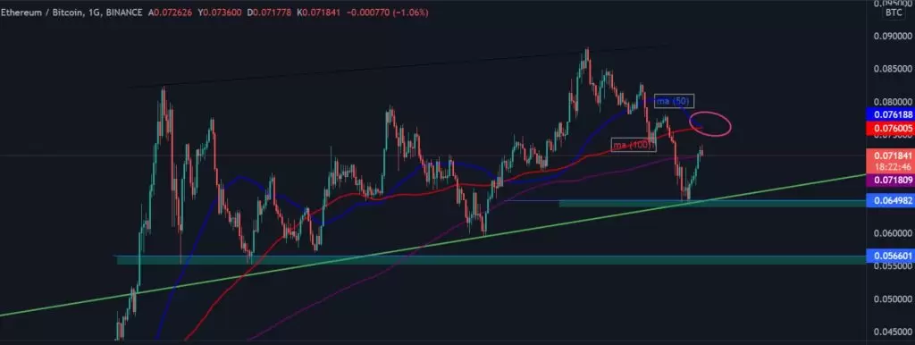 ETH/BTC partitesine baktğımızda ise aynı durumun orada da geçerli olduğunu ve BTC karşısında ETH değerinin hareketli ortalamaların altında hareket ettiğini görebiliyoruz.