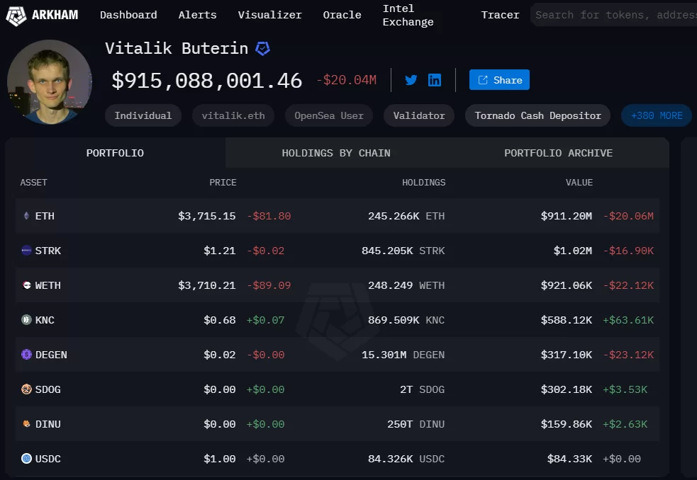 Arkhan Intelligence verilerine göre Vitalik Buterin’in cüzdanında şu anfa 845,205 STRK tokeni bulunuyor.