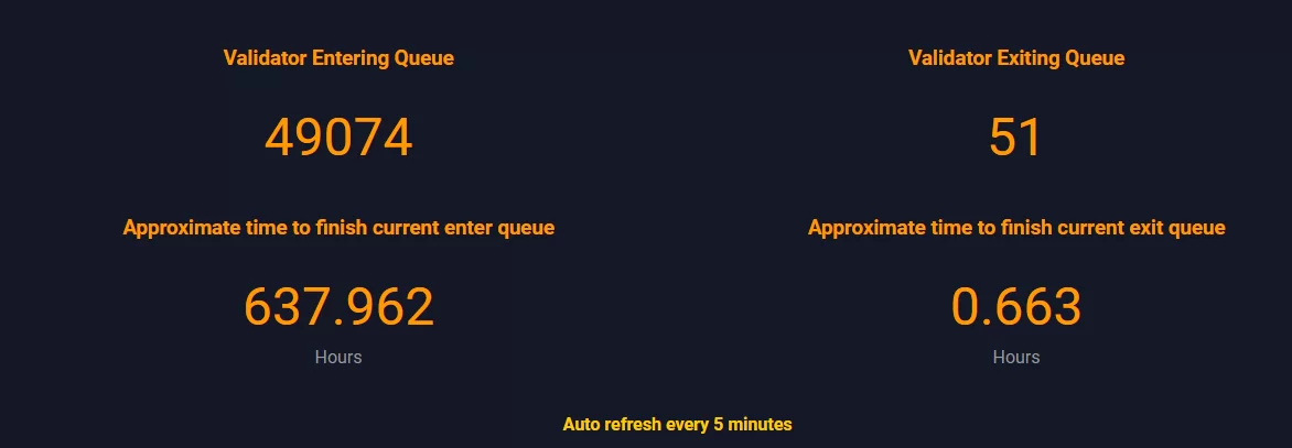 Ethereum staking için bekleme süresi yaklaşık 640 saat (26 gün) olurken ağdan çıkmak isteyen yatırımcıların talebi bir dakikadan az bir sürede gerçekleşiyor.