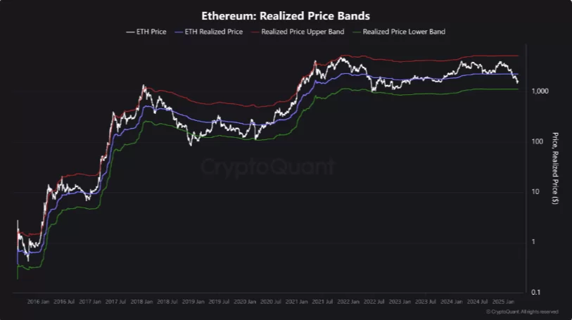 CryptoQuant analisti Ethereum’un gerçekleşen fiyatına yaklaştığını ve alt banta, yani tarihsel olarak rallilerin başladığı güçlü bir destek seviyesine yaklaştığını belirtti.