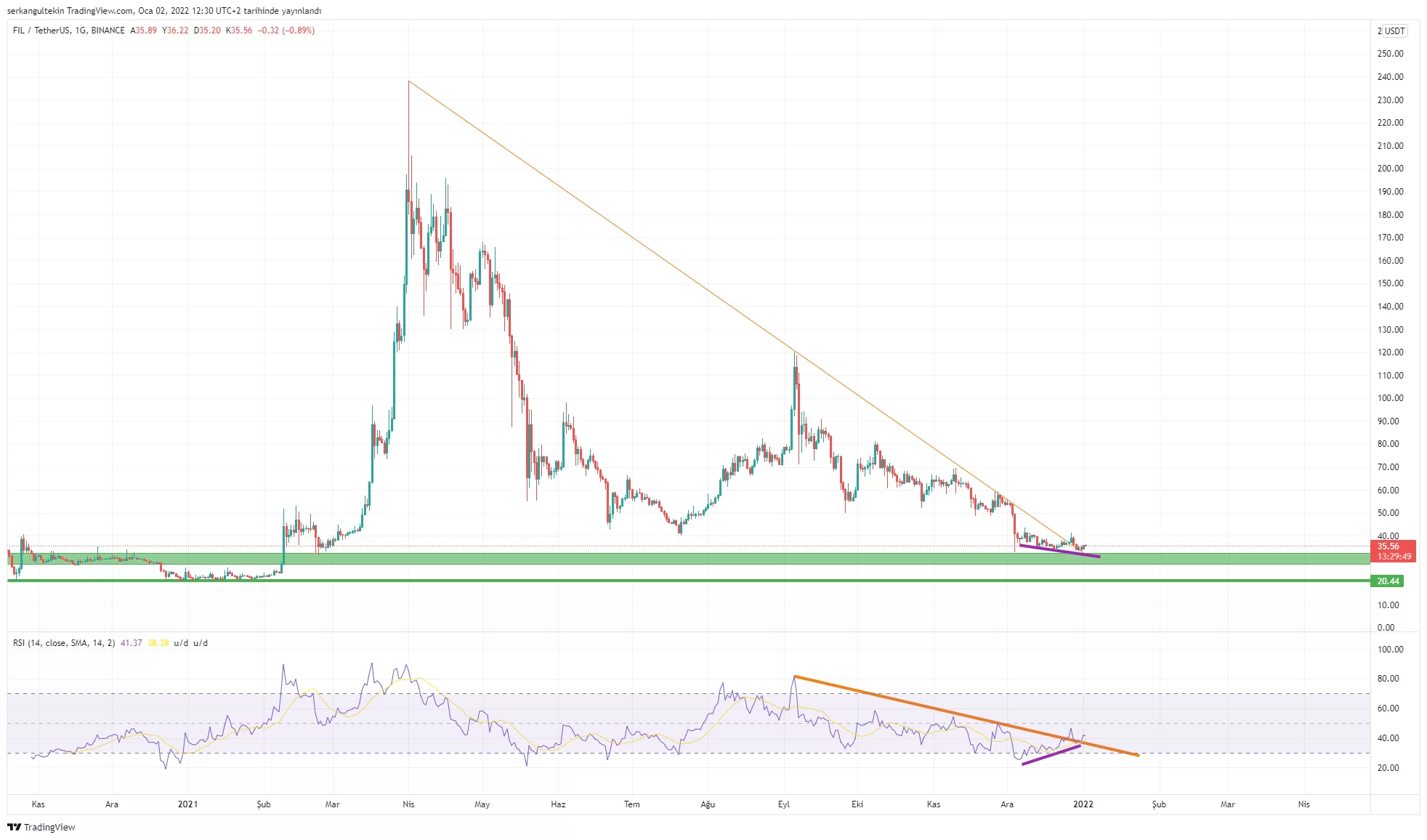 Bu noktada fiyat kısa vadede düşen bir trend içerisinde akümüle olmaya devam ederken, RSI’da yükselen bir trend (mor çizgi) olduğunu görüyoruz. Bu pozitif uyumsuzluk önümüzdeki haftalarda sert bir yükseliş gelebileceğine dair beklentilerimizi kuvvetlendiriyor.