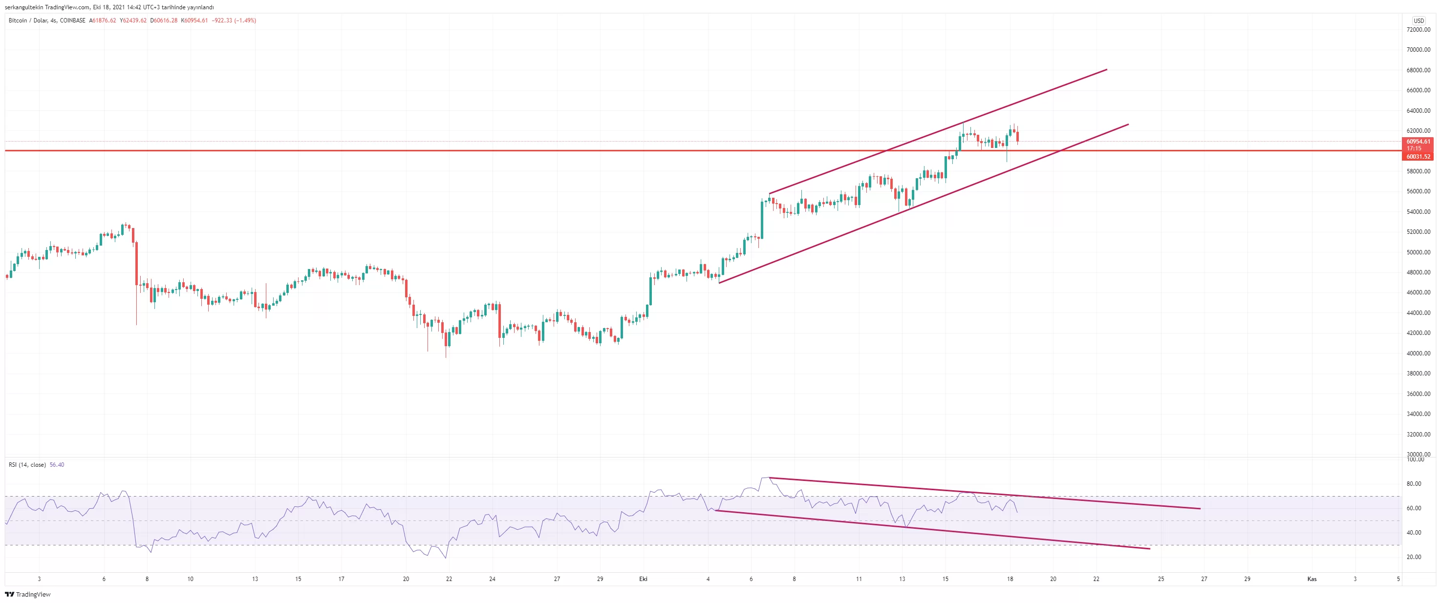 Bu yaklaşım fiyatın sürekli yükseleceği veya ara düzeltmeler yapmayacağı anlamına gelmez. Bu noktada oluşan tepelerin ve diplerin bir öncekilerde yüksek veya düşük olmasına göre trendin yönü tayin edilerek işleme girilmeli. Her ne kadar haftalık kapanış bir önceki zirvenin üzerinde yapılarak boğa sinyali verilmiş olsa da, alt zaman dilimlerinde RSİ’da negatif uyumsuzluklar olduğunu görüyoruz. Bu veride kısa vadede gelebilecek düşüşlere karşı hazırlık olmamız gerektiğini hatırlatıyor.