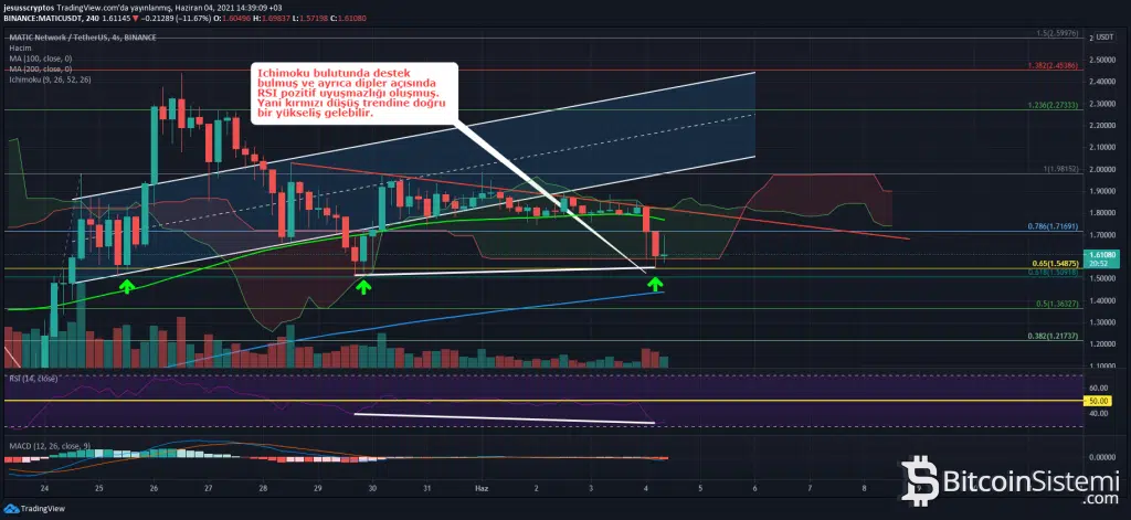 Bu desteği kaybetmesinin ardından gelen hem Ichimoku bulutunun alt bandı hem de fibonacci düzeltmesindeki önemli bölge olan 1.51 – 1.55 dolar aralığından destek aldığı görülüyor. Bu bölgeyi daha önce üç defa denediği görülen MATIC, eğer yeni bir düşüş dalgası gelirse bu desteği kırabilir. Bu kırılımda MA200 seviyesi olan 1.44 doların fiyat için önemli bir destek rolü oynaması bekleniyor.
