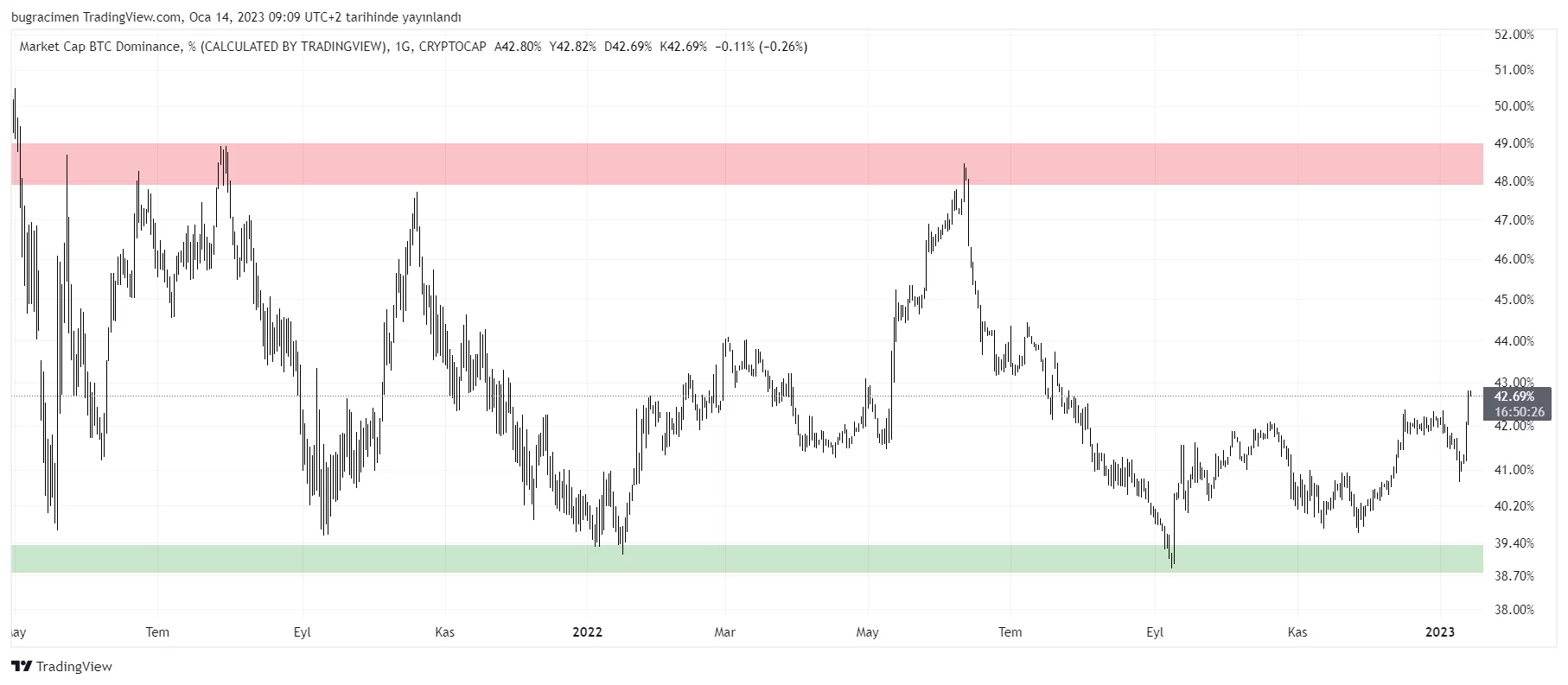 Bitcoin’in diğer kripto para birimlerine karşı baskınlığını ölçen BTC.D an itibariyle %42.70 olarak kaydediliyor. Bir buçuk yıldır 49-39 aralığında devam eden dominans verisi, Eylül ayında dipten aldığı destek ile yeniden yükselişe geçti.