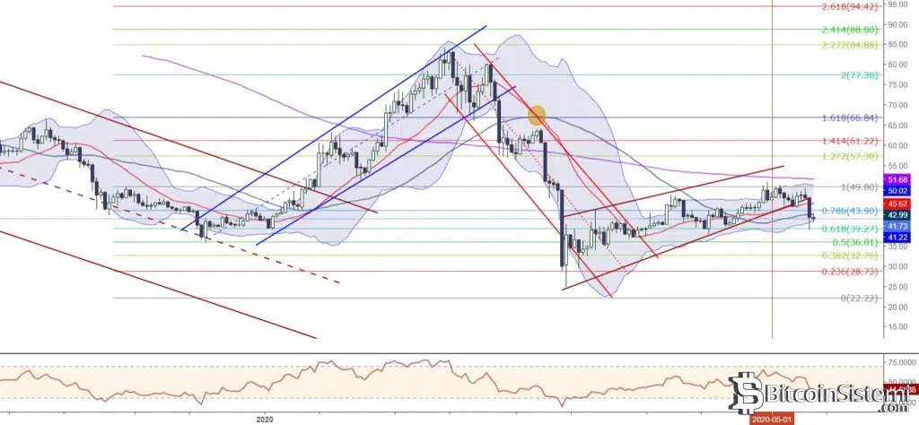 49 direncini periyodik olarak test eden LTCUSD kritik 43 desteğini kırarak günlük grafikte aşırı satım bölgesine ilerledi. Süreç içerisinde 39 desteğini test eden kripto para biriminde satış baskısının devam etmesi halinde 36, 32 ve 28 desteklerinin takip edilebileceği düşünülmektedir.