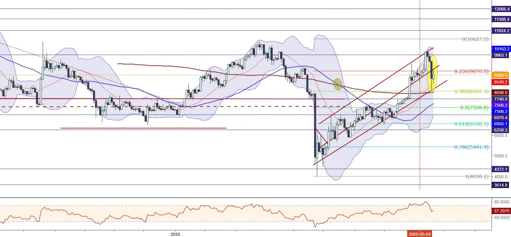 Geçtiğimiz hafta 10000 direncine kadar ivmelenen BTCUSD bulunduğu alanda satış baskısıyla karşılaşarak 8107 desteğine kadar çekildi. Sonraki süreçte long pozisyonların hacmindeki artışla birlikte tekrar ivme kazanan kripto para birimi 9000 direncini aşmaya çalışıyor.