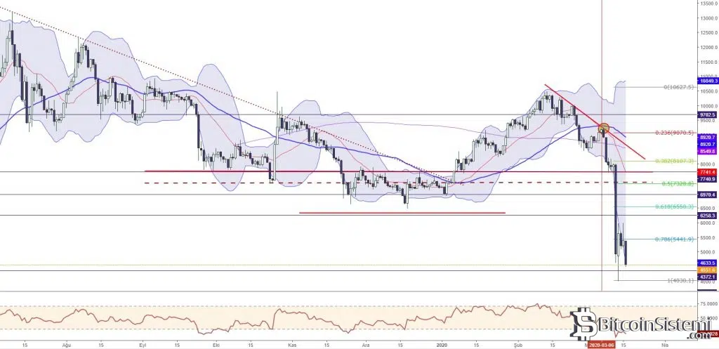 7 Mart 2020’den itibaren geri çekilme sürecine giren BTCUSD, koronavirüs sebebiyle yaşanan ekonomik daralmanın da etkisiyle sert satış baskısıyla karşılaşarak 3900 seviyelerine kadar geri çekildi. Halihazırda 5441 direncinin üzerinde tutunmakta güçlük çeken kripto para biriminin belirtilen alanda satış baskısıyla karşılaşarak aşırı satım bölgesindeki fiyatlamasına devam ettiği görülüyor.