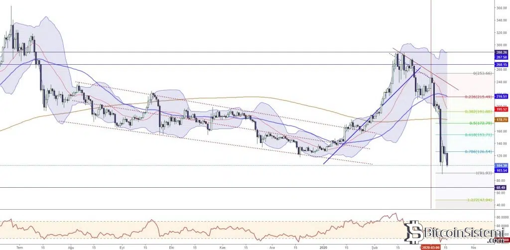 6 Mart 2020 tarihi itibari ile 250 seviyesine kadar ivmelenen ETHUSD, sonraki süreçte aşağı yönlü genişleme evresine girerek tarihinin en sert düşüşüyle karşılaşarak 91 desteğini test etmiştir. 91 seviyesinde tepki alımlarıyla karşılaşarak 126 direncini kırsa da belirtilen seviyenin üzerinde tutunamayan kripto para birimi tekrar geri çekilme sürecine girmiştir.