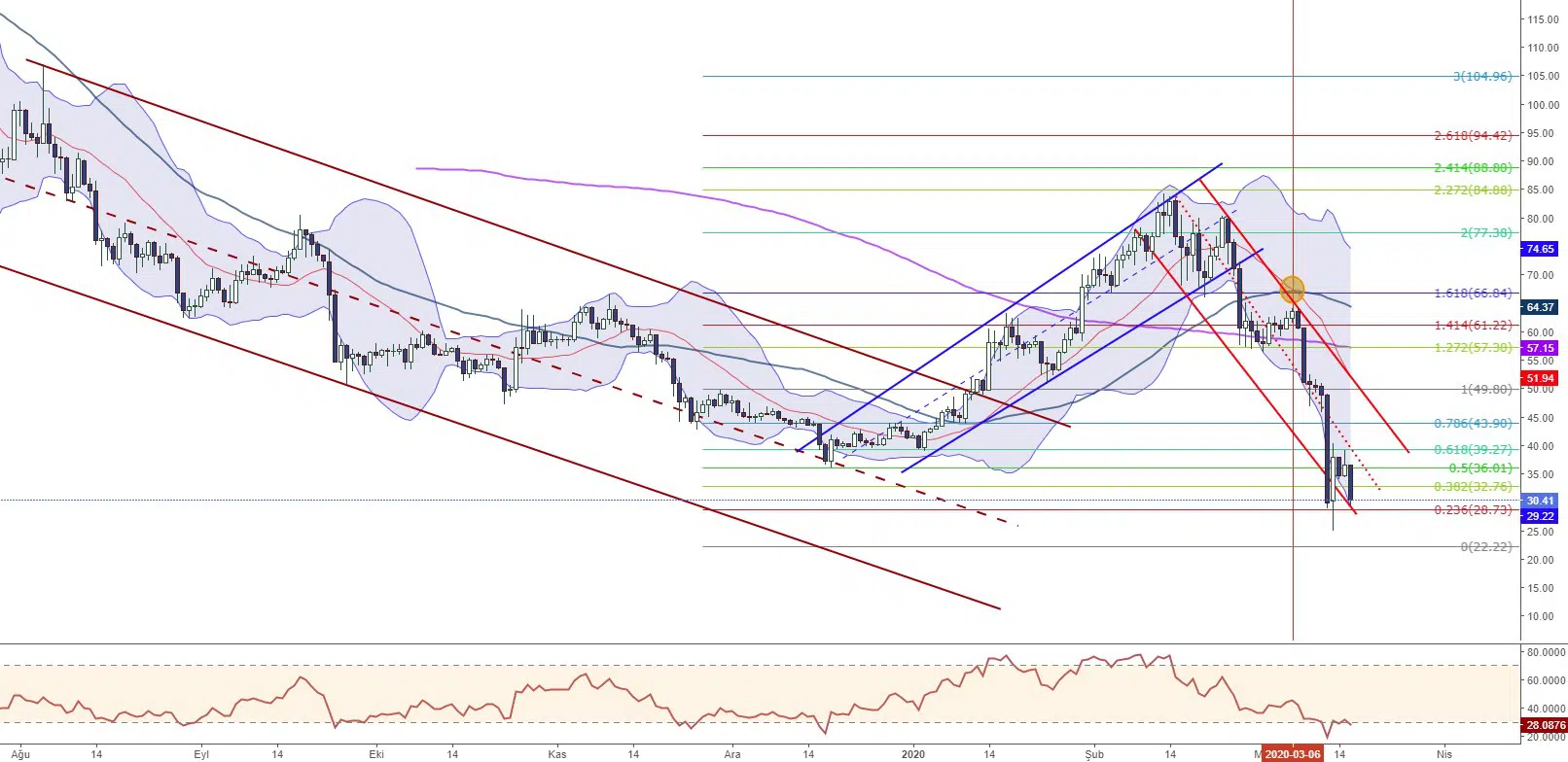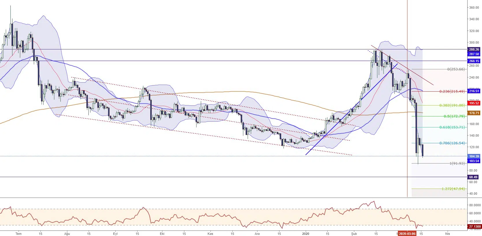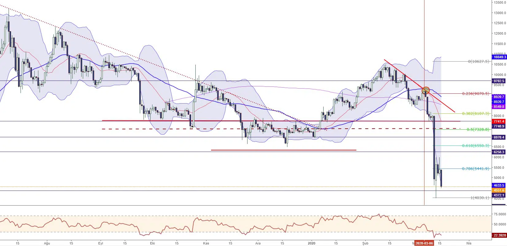 7 Mart 2020’den itibaren geri çekilme sürecine giren BTCUSD, koronavirüs sebebiyle yaşanan ekonomik daralmanın da etkisiyle sert satış baskısıyla karşılaşarak 3900 seviyelerine kadar geri çekildi. Halihazırda 5441 direncinin üzerinde tutunmakta güçlük çeken kripto para biriminin belirtilen alanda satış baskısıyla karşılaşarak aşırı satım bölgesindeki fiyatlamasına devam ettiği görülüyor.
