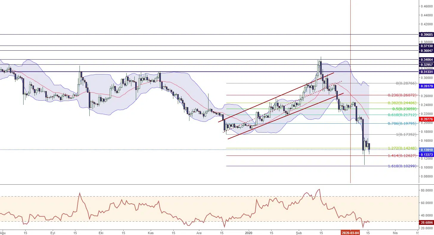 Gün itibariyle baktığımız zaman 0.1262 desteğine yönelen kripto para biriminin desteği kırması durumunda 0.1029, 0.0593 ve 0.0283 seviyelerinin sırasıyla takip edilebileceği düşünülmektedir. Küresel koşullarda iyileşme görülmeye başlanması ve belirsizliğin dağılması durumunda yukarı yönlü oluşabilecek hareketlenmeler tetiklenebilir. Böyle bir süreç içerisinde ise 0.1735’in üzerinde tutunması kripto para biriminde yukarı yönlü sıçramalara neden olabilir.