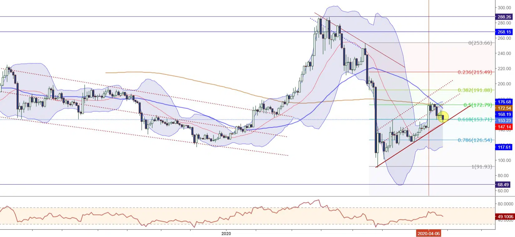 172 direncini test etmesinin ardından geri çekilen ETHUSD, aşırı satım bölgesine ilerleyerek 153 desteğini ve 20 MA’yı test ediyor. Satış baskısının devam etmesi halinde 138 ve 126 destek seviyelerinin takip edilebileceği düşünülmektedir.
