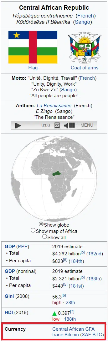 Bununla birlikte Orta Afrika Cumhuriyeti’nin İngilizce Wikipedia sayfasında da ülkenin resmi para biriminin BTC olarak gösterildiği dikkat çekti. Haberin henüz tam olarak doğrulanmadığını da hatırlatalım.