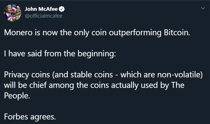 McAfee’ye Bitcoin’in durumu sorulduğunda ‘Bitcoin’in değersiz’ diyerek insanlara Monero, Ethereum, DAI stableceoin gibi kripto paralardan bahsetti. Hatta bir Tweet’inde Monero’nun artık BTC’den daha performanslı olduğunu ve gizlilik odaklı kripto paraların daha popüler olacağını söyledi.