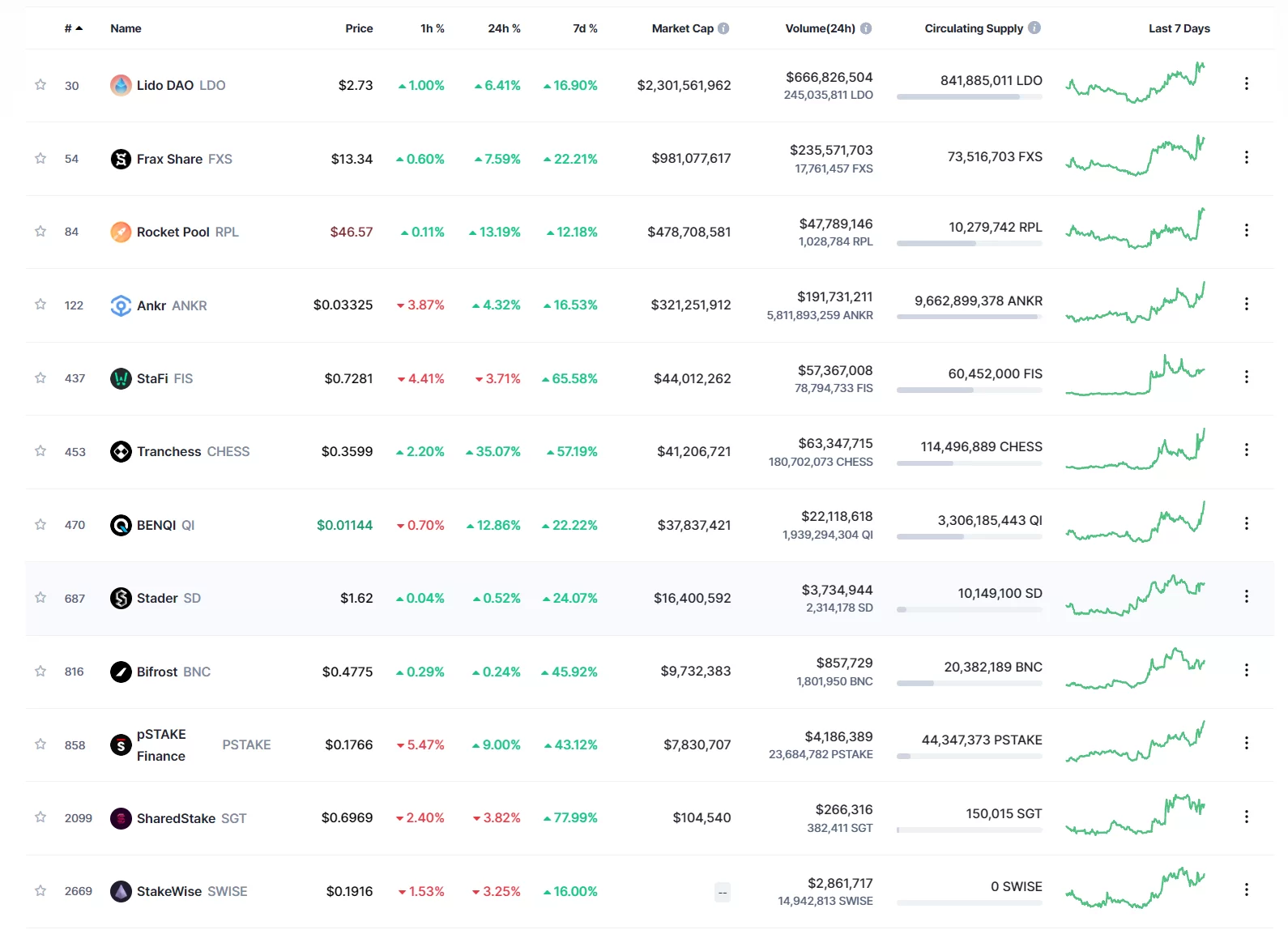 Coinmarketcap verilerine göre Likit Staking Türev Tokenleri şu şekilde:
