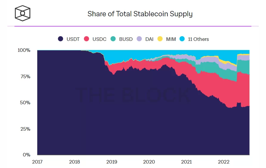 The Block’un verilerine göre, stablecoin pazarında USDT’nin payı son 1.5 yılda düzenli olarak düşüyor.