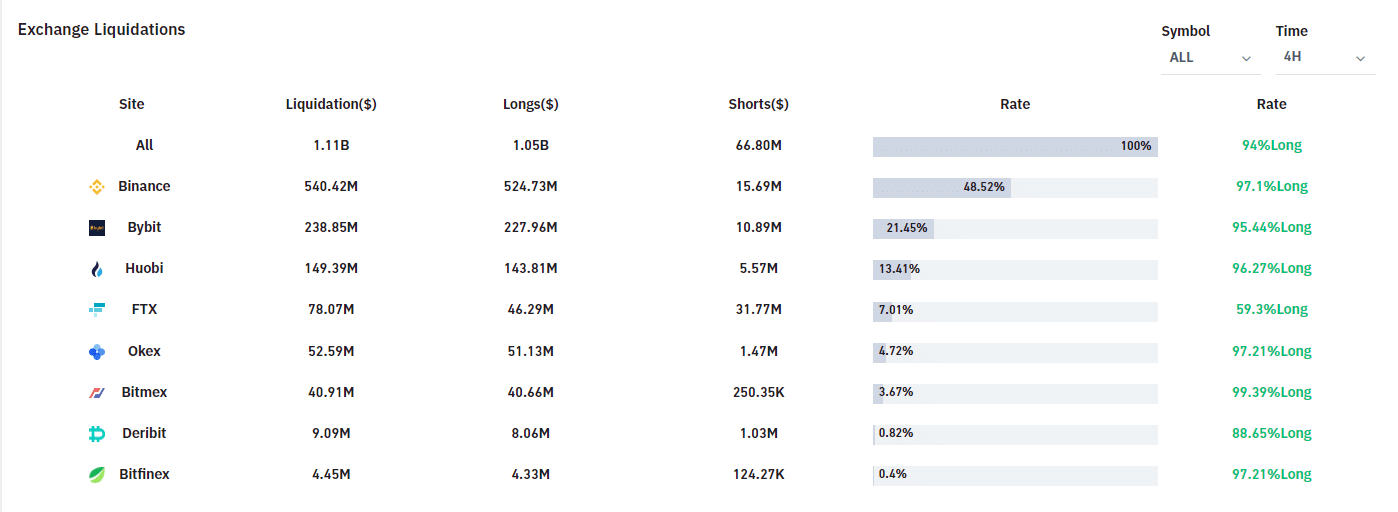 Ayrıca düşüş sırasında kazanan yine kripto para borsaları oldu. Son 4 saatte 1.11 milyar dolarlık long pozisyon tasfiye edildi.