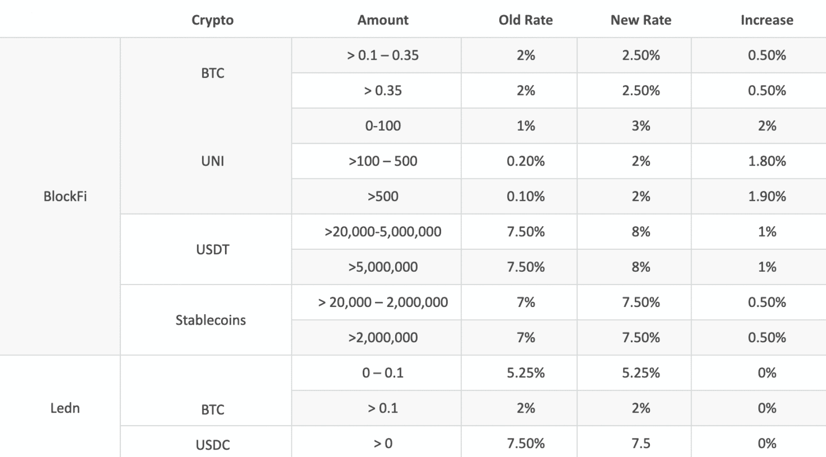 Faiz oranları, özellikle büyük platformlarda farkedilir düzeyde arttı. BlockFi, Gemini ve Crypto.com platformlarında faizler hızla artarken, Ledn’de ise oranlar şimdiye kadar değişmedi.
