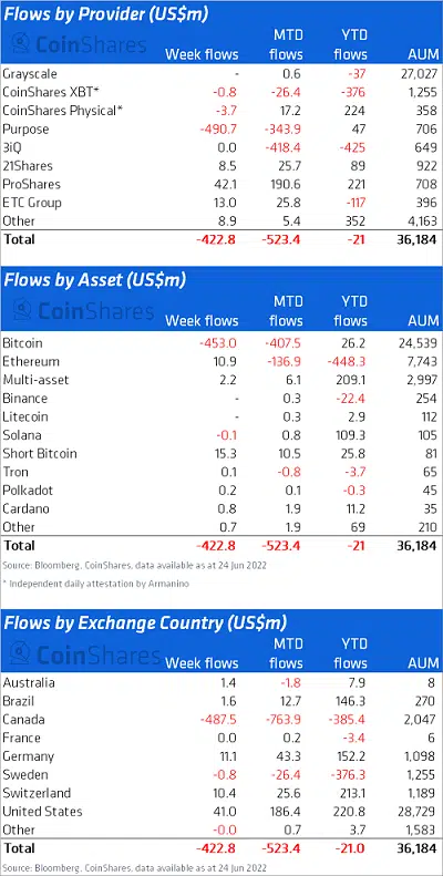 Coinshares’e göre yaşanan fon çıkışları 17 Haziran tarihinde gerçekleşti ancak kurumsal şirketler ve yatırımcıların bunları gecikmeli olarak bildirmesi nedeniyle bu değerler bu haftanın raporuna yansıdı.