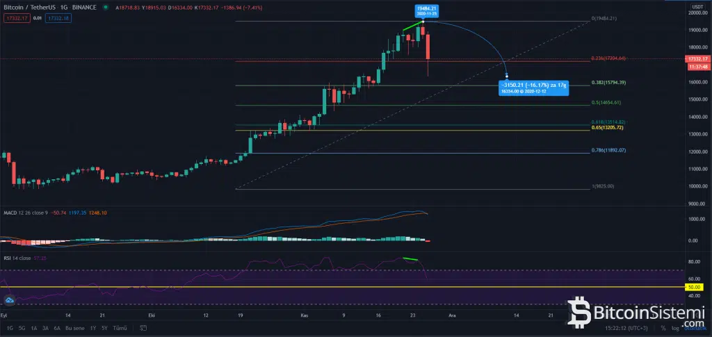 Bitcoin’de yaşanan düşüşün piyasadaki söylentilere bağlanmasının yanı sıra teknik analizde gözden kaçan bir durumun bu düşüşe yol açtığı daha net bir şekilde görülüyor. Bitcoin günlük grafiğinde 21 Kasım – 25 Kasım aralığında oluşan güçlü bir ayı uyuşmazlığı dikkat çekiyor. Nitekim buradaki RSI (göreceli güç endeksi) ve fiyat arasında uyuşmazlığın şimdilik %16’nın üzerinde bir düşüş getirdiği görülüyor.