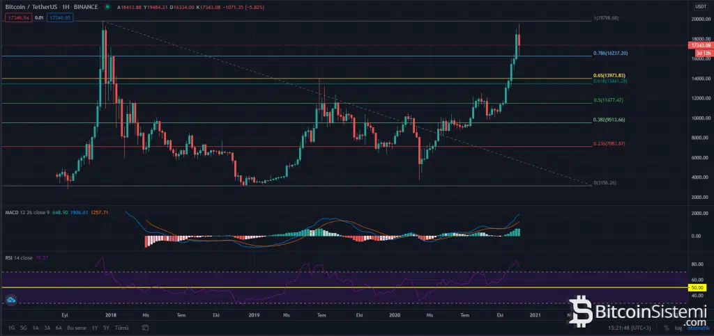 Yaşanan düşüşle birlikte piyasa değeri 320 milyar dolar seviyesine kadar gerileyen lider kripto para, başta 16.300 seviyelerine düşüş yaşadı ancak teknik açıdan şimdilik destekten dönmüş görünüyor. Uzun vadeli olarak haftalık mum grafiğine bakıldığında önemli seviyeleri görmek için Binance verilerine göre, Aralık 2017 yılındaki ATH seviyesi olan 19.798,68 dolar seviyesinden Aralık 2018’deki en düşük seviyesi olan 3.156,26 dolar seviyesine fibonacci uygulanabilir.
