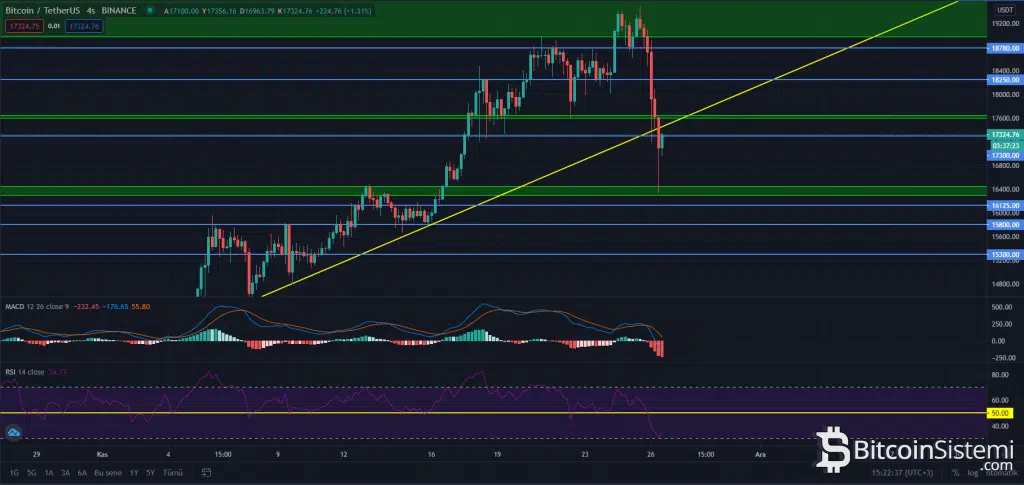 Yayın saati itibariyle 17.300 dolar seviyesinden işlem gören BTC, hızlı düşüşünü çabuk toparlayamadığı için korku yarattı. Ancak yaşadığı %16 üzerindeki değer kaybının %6’sını an itibariyle kazanmış durumda görünüyor. Kripto piyasasında yaşanan son zamanlardaki volatilite ve yaşanan düşüş göz önüne alınarak 4 saatlik BTC grafiğine bakıldığında, 16.300 – 16.450 dolar aralığı önemli bir destek alanı olarak yatırımcıları karşılıyor. Nitekim bugün fiyatın bu aralığa iğne attığı görülüyor. Ancak bu aralığının kaybedilmesi durumunda grafikte bulunan destek seviyeleri ve daha büyük zaman dilimleri olan günlük ve haftalık grafiklerdeki destek alanları takip edilebilir.