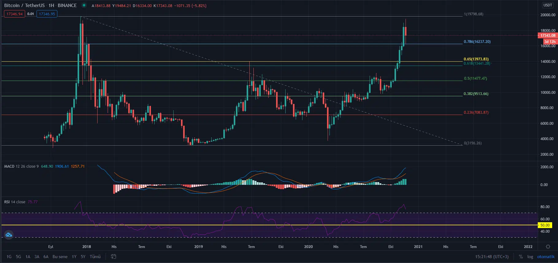 Yaşanan düşüşle birlikte piyasa değeri 320 milyar dolar seviyesine kadar gerileyen lider kripto para, başta 16.300 seviyelerine düşüş yaşadı ancak teknik açıdan şimdilik destekten dönmüş görünüyor. Uzun vadeli olarak haftalık mum grafiğine bakıldığında önemli seviyeleri görmek için Binance verilerine göre, Aralık 2017 yılındaki ATH seviyesi olan 19.798,68 dolar seviyesinden Aralık 2018’deki en düşük seviyesi olan 3.156,26 dolar seviyesine fibonacci uygulanabilir.
