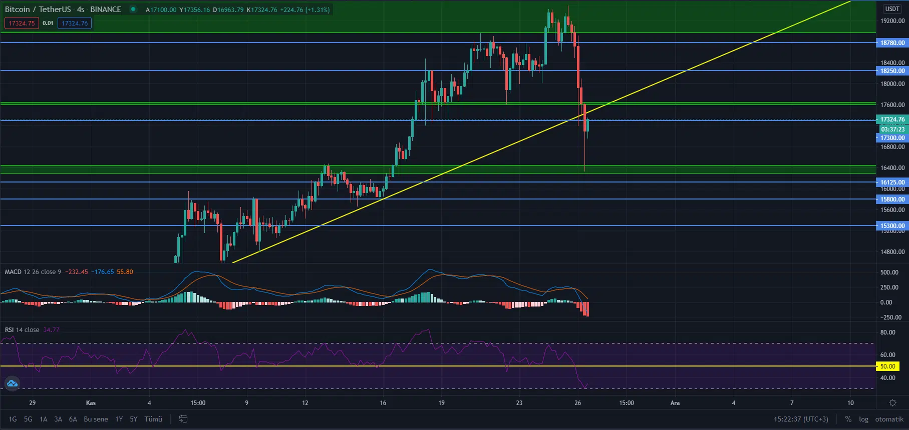 Bitcoin’de yaşanan düşüşün piyasadaki söylentilere bağlanmasının yanı sıra teknik analizde gözden kaçan bir durumun bu düşüşe yol açtığı daha net bir şekilde görülüyor. Bitcoin günlük grafiğinde 21 Kasım – 25 Kasım aralığında oluşan güçlü bir ayı uyuşmazlığı dikkat çekiyor. Nitekim buradaki RSI (göreceli güç endeksi) ve fiyat arasında uyuşmazlığın şimdilik %16’nın üzerinde bir düşüş getirdiği görülüyor.
