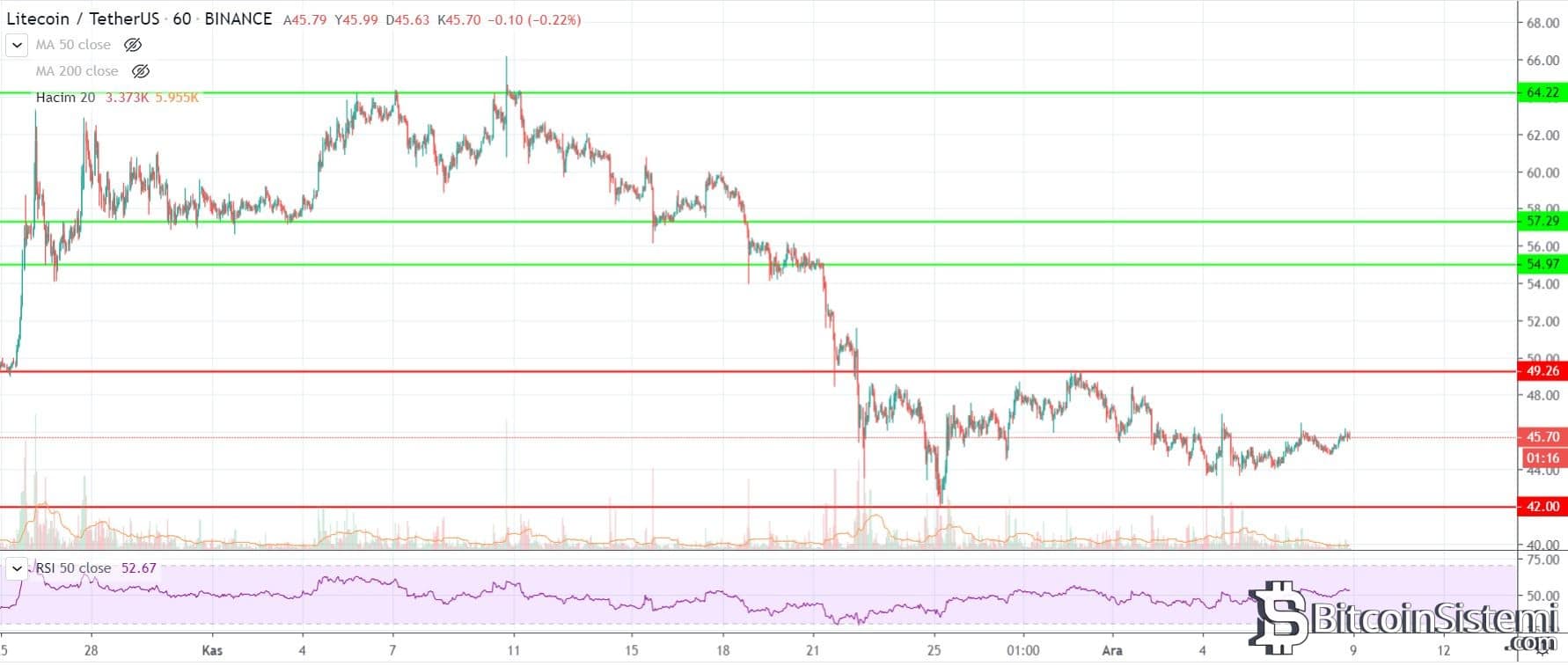 An itibarı ile LTC’nin 42 dolarda önemli bir destek seviyesi bulunurken, direnç noktaları ise 49, 54 ve 57 dolar seviyelerinde.