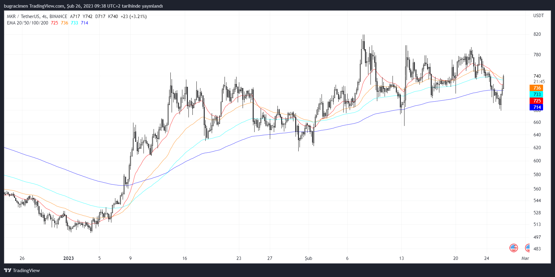 Yıla 500$ civarında başlayan MKR Şubat ayının ik günlerinde 820 dolara kadar tırmandı. Maker, Şubat ayında yatay hareket etse de 200 günlük üstel hareketli ortalamanın (mavi renk) üzerinde kalmayı başardı.
