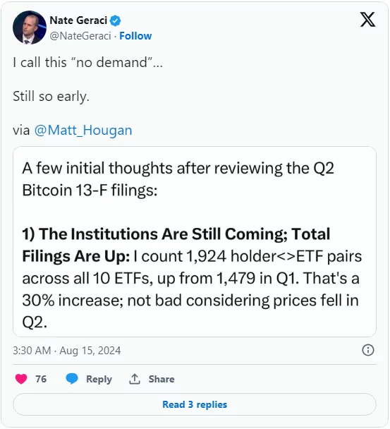 Bu olumlu görünüme, Bitcoin (BTC) ETF’lerine yönelik büyüyen kurumsal ilgi de ekleniyor. Goldman Sachs gibi büyük oyuncular Morgan Stanley’e önemli destekte katılıyor. 2. çeyreğin sonunda, bu firmalar ABD merkezli spot Bitcoin (BTC) ETF’lerinde 4,7 milyar doların üzerinde bir gelir elde etti ve Goldman Sachs 418 milyon dolar katkıda bulundu. Bu kurumsal destek, özellikle Harris müdahalesiz bir yaklaşım sürdürürse, piyasa duyarlılığını güçlendirebilir. Bu faktörler bir araya geldiğinde, Bitcoin’in (BTC) 71.902 dolar ve 79.192 dolar direnç seviyelerine meydan okuyabileceğini ve Harris’ten gelen olumsuz sinyallerin eksikliğinin piyasa için potansiyel olarak yükseliş göstergesi olabileceğini gösteriyor.