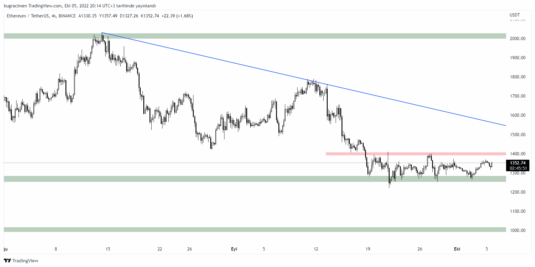 ETH, düşüşlerin ardından 1.250-1.280$ aralığında bir destek alanı oluşturdu ve son 1 aydır 1.250-1.400$ aralığında yatay bir seyir gösteriyor.
