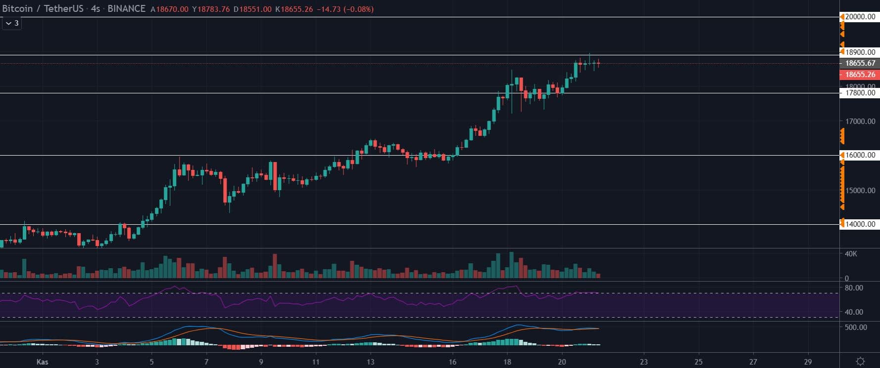 Bitcoin fiyatında gelecek hafta içerisinde büyük beklentiler var. 18.965 seviyesinden geri dönen Bitcoin’in eğer ki büyük bir düzeltme görürse bu durumda fiyatının 16.019 dolara kadar düşebileceği, eğer çok büyük bir düzeltme olursa mevcut 18.564 dolar seviyesinden 14.000 dolara kadar büyük düzeltmeler görebileceği belirtiliyor. Ancak 18.500 dolar direncini bugün 18.700 doları aşarak kıran BTC’nin 19.500 dolar seviyesinin üzerine çıkıp bir anlık balina desteğiyle en büyük psikolojik sınır olan 20.000 dolar sınırını gelecek haftanın sonuna gelmeden hemen önce geçebileceği belirtiliyor. Gelecek hafta mutlaka BTC’yi izlemek çok daha iyi sonuçlar verebilir.