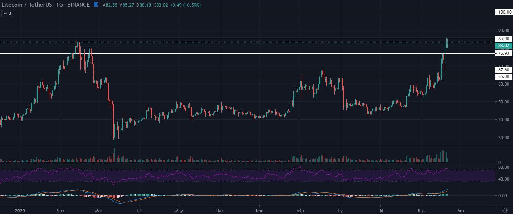 Litecoin (LTC) fiyatı gün içerisinde 85 dolara kadar ulaştı. Kısa süre içerisinde büyük düzeltmeler beklenmezken 52 haftanın en yüksek fiyat seviyesi bugün görüldü. Yatırımcıların bu dönemde beklentisinin öncelikle 100 dolar direncin kırılması ardından ise hızlı bir şekilde 140 dolara odaklanmaları yönünde tavsiyeler mevcut. 85 dolardan sonra ilk hamlenin 100 dolar, ardından 125 dolar ve en son olarak 140 dolar olup yeniden düşüş görülmesinin olası olabileceği belirtiliyor.