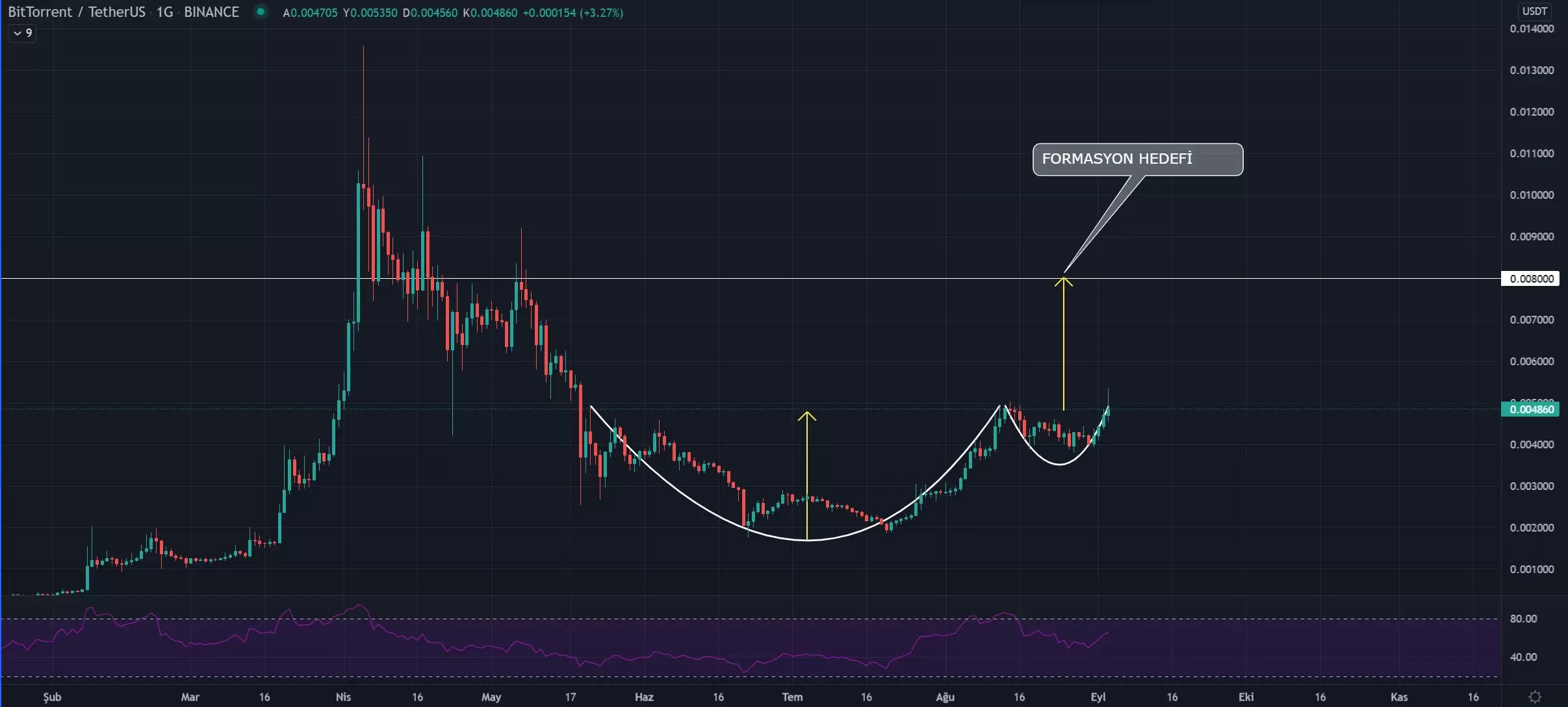 Günlük periyota bakıldığı zaman fincan kulp formasyonu oluşan grafikte, hedefin formasyon gereği 0.0075 – 0.0080 dolar olduğu ortaya çıkıyor. Formasyonun tam önemli bir kırılım noktasında olduğu görülürken 0.0049 dolar seviyesinin önemi dikkat çekiyor. Eğer bu direnç kırılır ve formasyon tamamlanırsa yakın zamanda BTT yaklaşık yüzde 60’lık bir ivmelenme yaşayabilir.