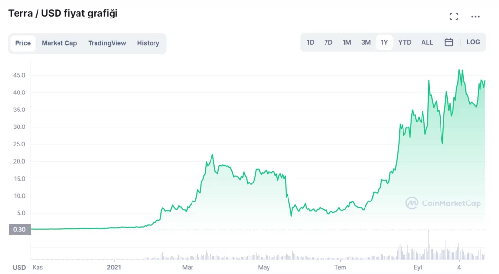 Fırsat vadeden kripto paraları keşfeden ve yatırım yapan yatırımcılar kısa sürede yüksek kârlar elde edebiliyor. AXS, SOL, LUNA bunlara bir kaç örnek. Örneğin LUNA, son 1 yılda yaklaşık % 14.000’lik bir artış gösterdi. 1 yıl önce 0.300 dolardan işlem görürken şu an 43.50 dolara satılıyor.