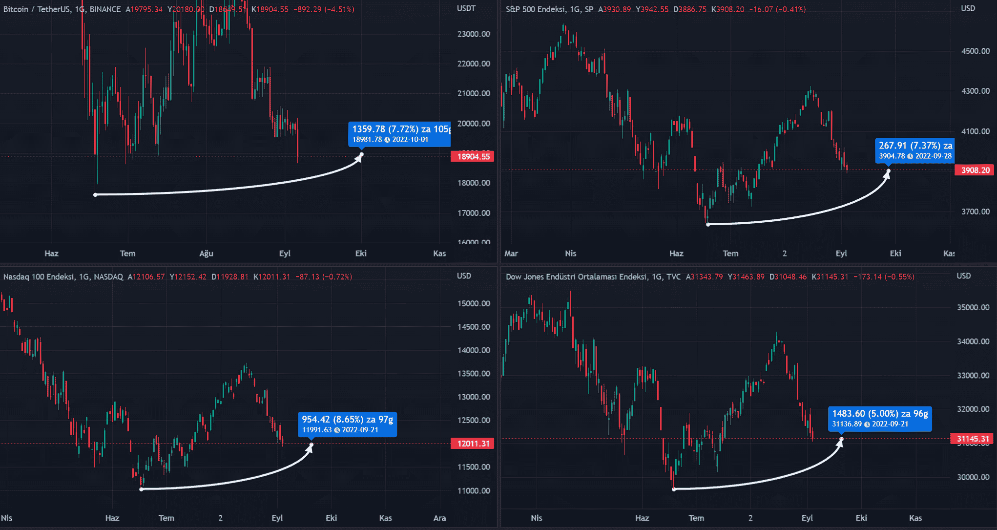 ABD Borsaları olan S&P 500, Nasdaq ve Dow Jones tarafına baktığımız zaman da Bitcoin ile hemen hemen aynı dönemlerde 2022 yılının dibini gördükleri ve şimdi ise bu seviyeden yüzde 5 ila 8 yukarısında işlem gördükleri dikkatlerden kaçmıyor.